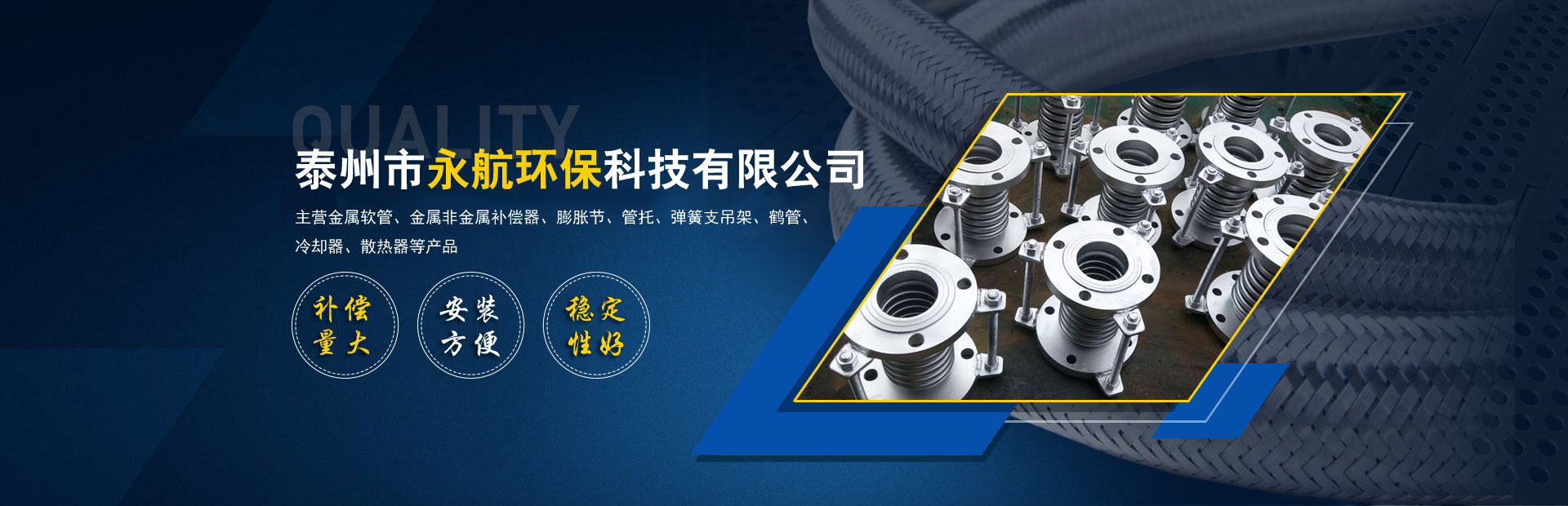公司專注從事設(shè)計制造金屬膨脹節(jié)、不銹鋼金屬軟管、波紋管補(bǔ)償器、不銹鋼軟管、不銹鋼波形波紋補(bǔ)償器、矩形補(bǔ)償器、非金屬補(bǔ)償器、冷卻器、換熱器、風(fēng)門、法蘭、管件、墊片、橡膠補(bǔ)償接管、減振器、減振墊和各類高壓軟管產(chǎn)品。